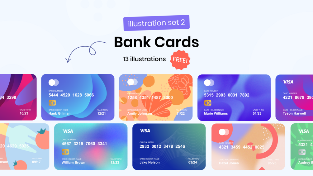 Bank Cards is a set of custom bank cards illustrations suitable for multiple different topics. This illustration set was built to help designers use real looking fake bank cards when designing.