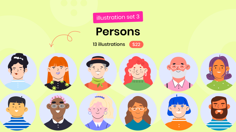Persons is a set of custom "avatars" illustrations suitable for multiple different topics. This illustration set was built to demonstrate avatars of people of different skin colors, hair types and personalities.