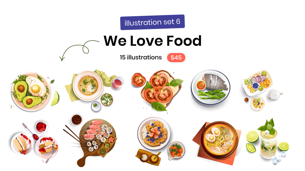 We Love Food is a set of custom Food illustrations suitable for multiple different topics. This illustration set was created with the most popular food and takeout items. so yummy :)